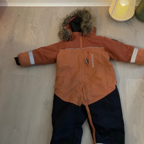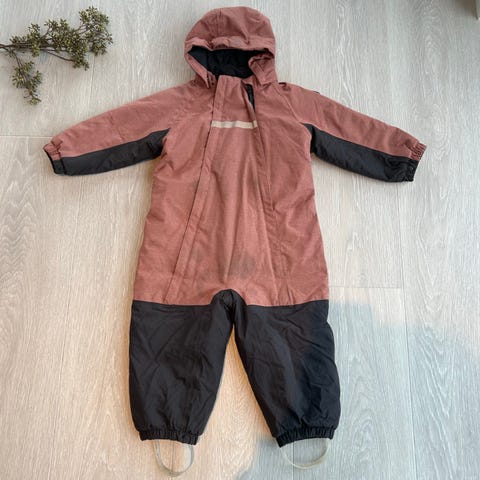Vinterdressen er pent brukt, men har dessverre fått et par rifter på setet (se på bilde), men har ikke blitt hull, og det mangler fotstrikk. Kan fint bruke eller som reservedress i barnehagen 🙂