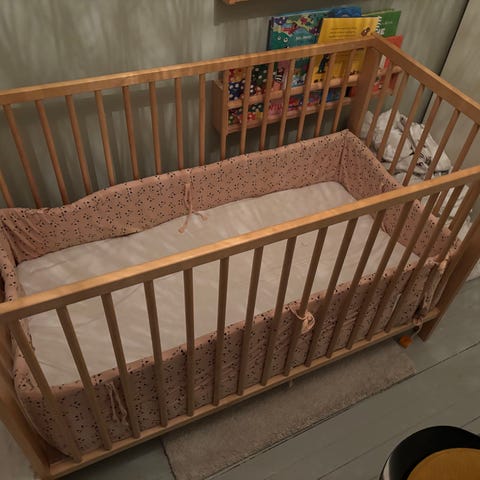 IKEA Sprinkelseng laget i tremateriale. Passer for små barn og har en enkel design med spiler rundt for sikkerhet. Sengen står på fire ben med vuggebein, kan fjernes. Leveres med madrass som vist på bildene. Lite brukt av 1 barn.