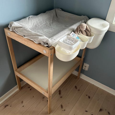 Praktisk oppbevaringsplass innen rekkevidde: du kan alltid holde én hånd på babyen.