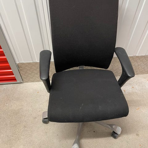 HÅG 05 kontorstol i sort stoff med skinn armlener og nakkestøtte. God ergonomisk stol med mange justeringsmuligheter. Meget pen i stoffet - ingen skader!
