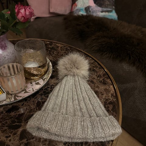 Sort ulllue med sydde kanter rundt og bånd laget som en blomst pynt på siden