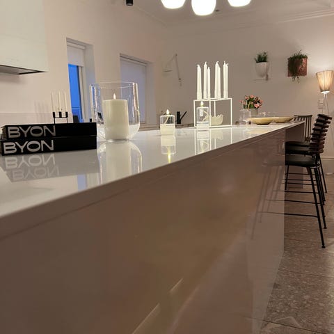 Vitrineskapene er 80cm brede, samme med skuffene under