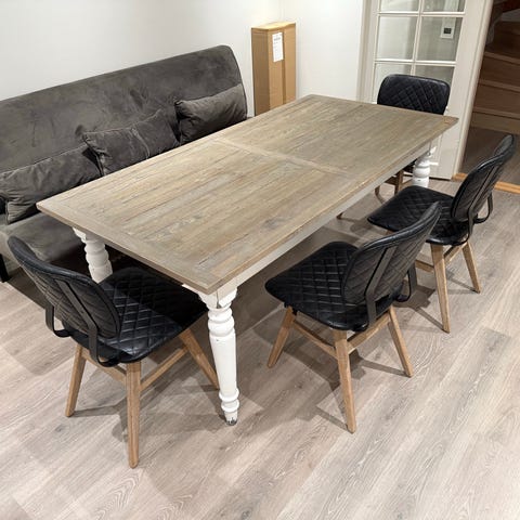 Spisestuesett med bord, seks stoler og sofa i tre og burgunder stoff