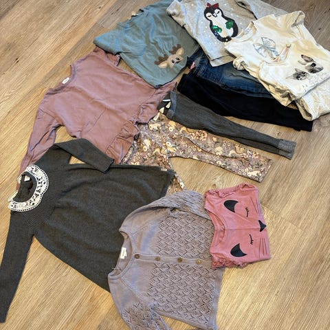 2 stykk strømpebukser. Jeg vet desverre ikke størrelsen på disse da lappene har blitt klippet av. Disse legges ved i klespakken fordi alle her har vokst fra de, men jeg har ikke priset noe ekstra for de.