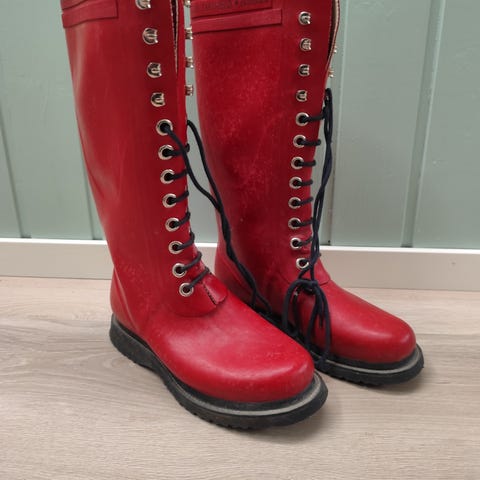 Ilse Jacobsen RUB1 regnstøvler i størrelse 37. Støvlene er røde og har snøring foran. De er laget for å gi beskyttelse mot vått vær.