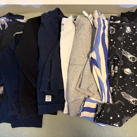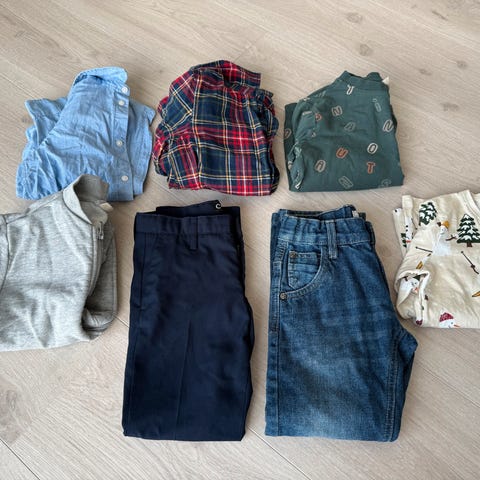Alle klærne er kjøpt nye av oss og brukt til ett barn. Foruten et lite hull på armen på den ene genseren (se bildet) er klærne hele og pene uten skader eller merker.