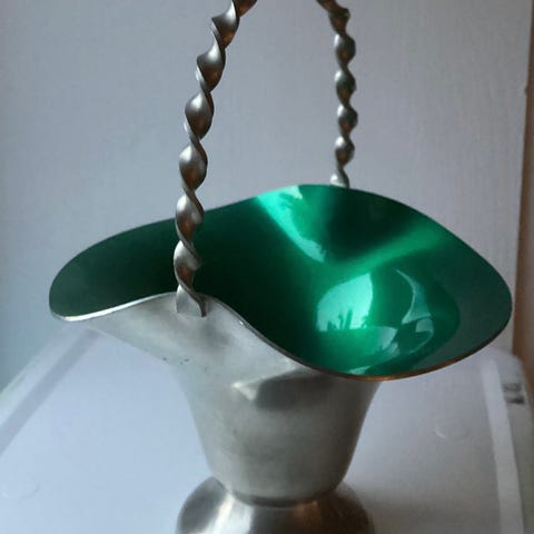 Koboltblå glasskål som ligger i en metallkurv på stett