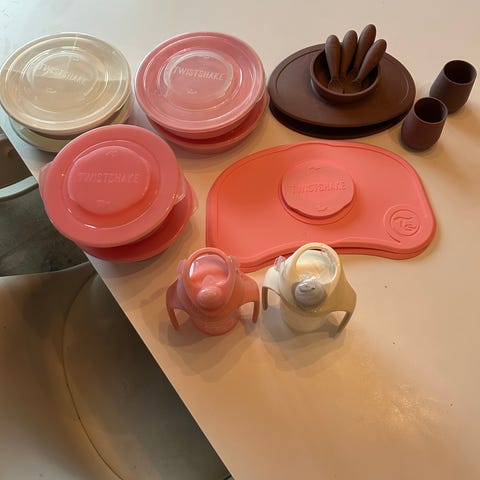 Div. Drikkeflasker, skål, fat, silikon fat med sugekopp, oppbevarings boks for pulver, kjøkkensett barn.