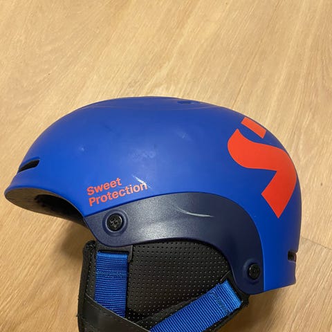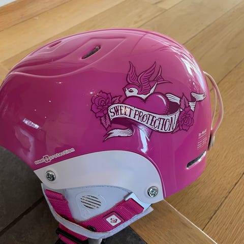 Sweet Protection skihjelm for barn. Str. M/L (56-59cm). Skibriller (merke House of Hygge) følger med. Brukt i flere sesonger, men er pent brukt og ikke utsatt for harde fall eller annen skade.