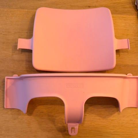 Stokke bøyle med ryggstøtteog ekstra polstring. Setet er i hvit plast med et mykt, avtagbart trekk for komfort. Passer Stokke stol.