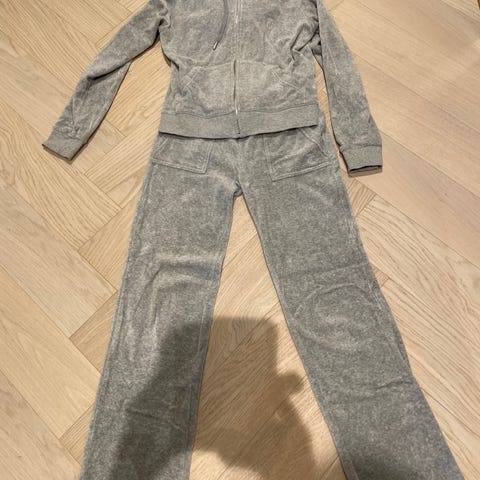 Juicy Couture sett med bukse og hettejakke, passer str. XS-S (buksen er str. XS, lagt opp slik at innerbenlengden er ca 77 cm, jakken er str. M og veldig liten i størrelsen). Gråmelert, pent brukt. Selges samlet for kr. 500,-.