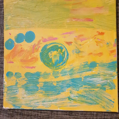 Abstrakt maleri med fargerik akryl på lerret. Maleriet har en dynamisk sammensetning av farger som inkluderer gult, rødt, blått, svart, hvitt og lilla. Passer til dekorasjon av vegg i ulike rom. Bilde malt av Snapchat influenser Terese Kristiansen: teresek81. 30 X 40 cm.
