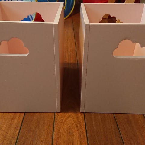 Dessverre har øverste del (ca en remse horisontalt bortover på ca 10 cm i høyde langs hele fremsiden) knekt av inni stoffet pga barna har lent seg nedi kassen for å ta ut duplo. Denne kan muligens fikses om en åpner stoffet på kassen på innsiden og forsterker eller bytter platen.