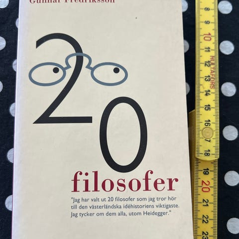 Pan 20 filosofer bok med portretter og beskrivelser av kjente filosofer som Descartes, Hobbes, Spinoza, Leibniz, Hume, Locke, Voltaire, Kant, Hegel, Schopenhauer, Kierkegaard, Mill, Nietzsche, og Heidegger.