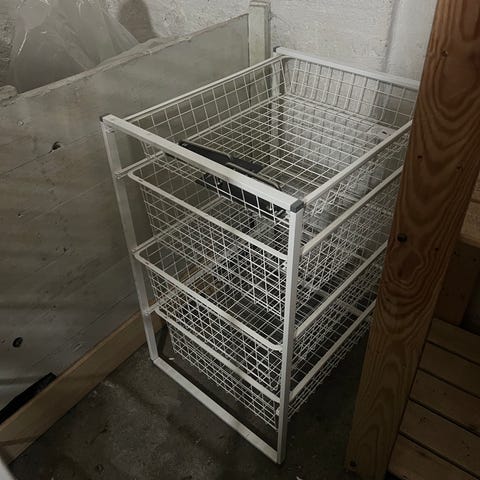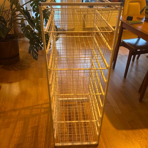 God brukte elfa trådkurver i reol.