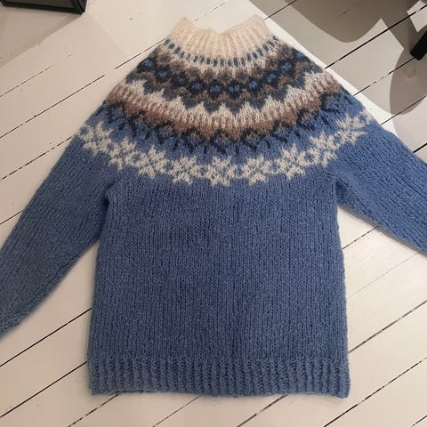 Strikket i viking Mohrino garn,lodden og myk genser,modellen er overside.