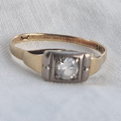 Ringen er arvet og fremstår som solid håndverk i klassisk stil. Steinen har et nydelig fargespill i gul–grønn/oliven tone, med naturlige inneslutninger som bekrefter ekte naturstein. Design og utførelse tilsier at ringen er fra ca. 1950–1970-tallet. Tydelig 585 stemplet (14 karat gull), dokumentert på bilde.