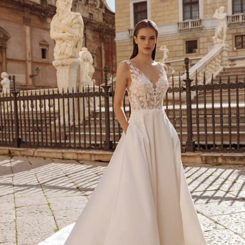 Helt ny og ubrukt Modeca Kaya brudekjole i str 38. Kjøpt i 2021 hos Belle Amie i Bergen. Pga covid og baby ble bryllup utsatt og den har derfor ikke vært brukt. Den er heller ikke blitt tilpasset til meg og har hengt i posen fra butikk siden kjøp. Ny pris var ca 18.000.
