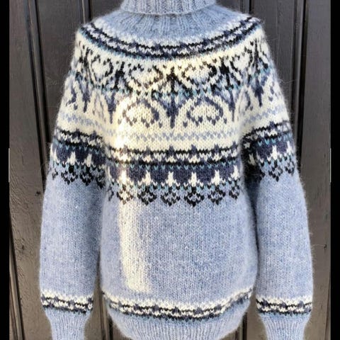 Nydelig tykk genser fra Island, merke Alafoss i 100% islandull. Størrelse L, brystvidde 120 cm lengde 61 cm.