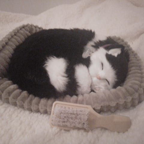 Kosedyr i form av en sovende katt med grå og svarte striper. Laget med myk pels og detaljer som ligner en ekte katt i hvileposisjon. Pusen puster.