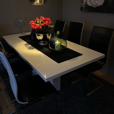 Bord med fire stoler selges, bordet kan åpnes og bli større.