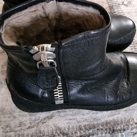 Nude of Scandinavia vinterstøvler i størrelse 38. Støvlene er svarte i semsket skinn og har glidelås på siden og en til pynt bak. De er laget for å gi varme og beskyttelse i kalde værforhold.
