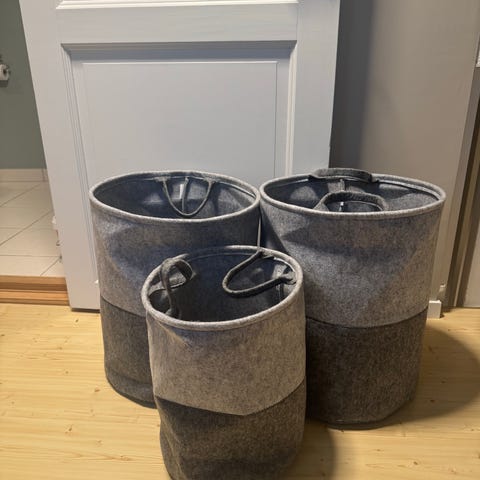 2 stk oppbevaringskurver til leker i stoff. De har motiv av søte bamser med ører. Pent brukt til duplo, men noen bruksmerker nedi kurven forekommer (se bilder).