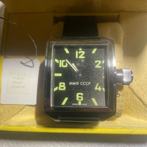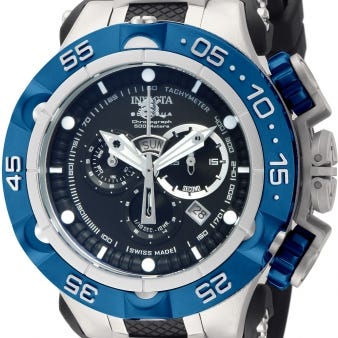 Invicta Pro Diver herreklokke med kronograffunksjon, rustfritt stål og vannmotstand. Klokken har en blå urskive med gullfarget lenke og detaljer, samt tydelige markører og visere. Brukt som utstyr til moteklær foto den har blitt brukt ca 1 uke
