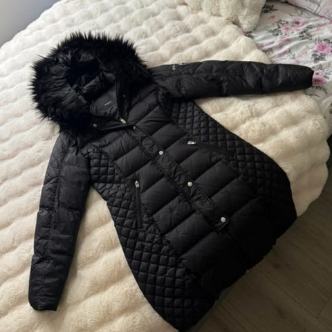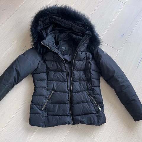 Fin vinterjakke fra ROCKANDBLUE i str. 42. Jakken er i en dus grønnfarge og laget av dun, som gir god isolasjon og varme. Egnet for kalde værforhold. Hetta har pelskant. Modellen er innsving i livet og har en feminin fasong. Kan sendes.