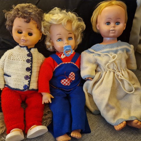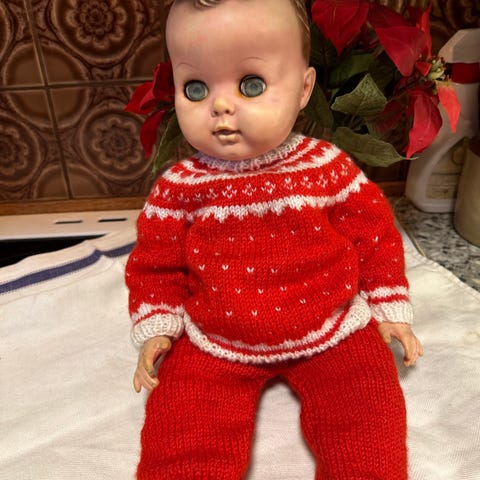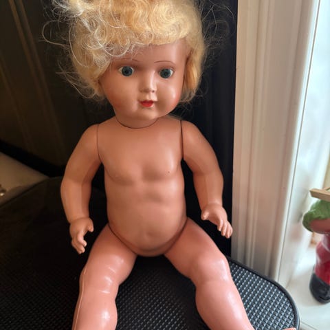 Flott gammel dukke fra -50 tallet. Blitt litt slitt med årene, men er fortsatt et flott samleobjekt. Har originale klær og sko. Sveisen/ håret har nok blitt forandret. Prøvde nok å gi henne en annen frisyre… men det var ikke frisør jeg ble😂Kjolen trenger en vask og den ene skoen mangler en såle. Benet har gått litt opp i limingen. Kan sikkert fikses av en nevenyttig. Ser hun også har mistet en fing. Stakkars. Har stått mange år til pynt. Så ønsker seg et nytt hjem nå med mere omsorg. Selges 700kr pluss frakt. Kan sende.
