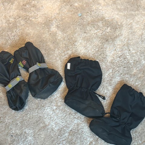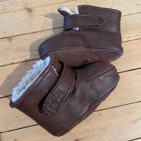 Gode og varme skinntøfler til baby. De har vært helt gull å ha på i vogna og på hytta. Myke og varme. Noe bruksmerker, men ingenting å si for bruken.