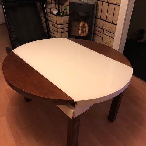 Bordet har normal bruksslitasje (se bilder), men er i god stand og svært stødig. Passer godt til spisestue, kjøkken eller hytte.