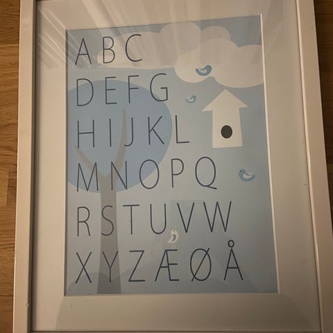 Alfabetplakat fra Sebra inkl ramme i eik.