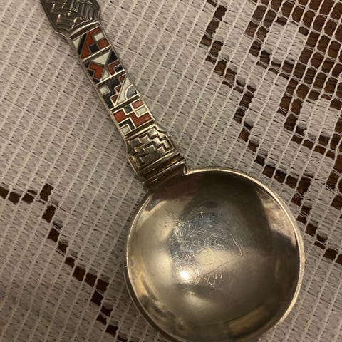 Sett med 6 teskjeer med emaljert håndtak i ulike farger. Skjeene er laget i metall med dekorative detaljer på håndtakene. Egnet for servering av te eller kaffe. De er belagt på 925 sølv. Stempel under alle. Lengde 9,5 cm. Selges for 200,- pr stk eller kr 1000,- for alle. Kan hentes Stavanger eller sendes mot betaling av porto.