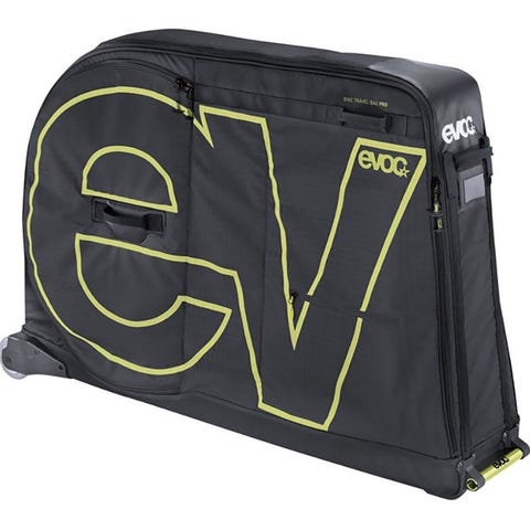 Evoc sykkelbag med hjul i blå og svart farge. Baggen har flere rom og lommer for oppbevaring av sykkel og tilbehør. Designet for enkel transport og beskyttelse av sykkelutstyr under reise.