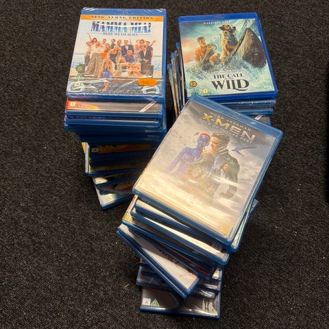 Bokser inneholdende et utvalg Blu-ray filmer i ulike titler og sjangre. Filmene er pakket i original plast og oppbevart i pappesker.