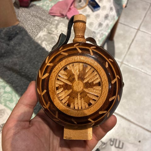Den fugleformede proppen er et lite kunstverk i seg selv. Detaljerte utskjæringer og det varme treverket gir den en autentisk, håndlaget følelse.