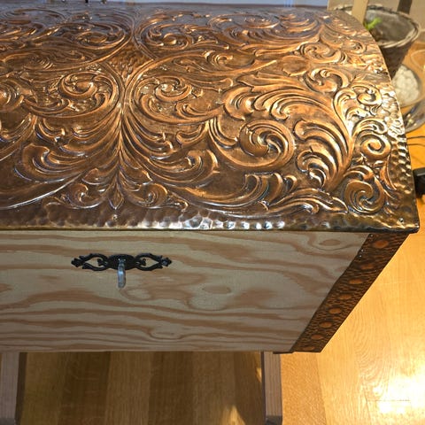 Antikk malt kiste med dekorative blomster- og bladmønstre i flere farger. Kisten har buet lokk og metallbeslag foran. Innvendig er kisten foret med mønstret papir. Kan brukes til oppbevaring eller som dekorativt møbel.