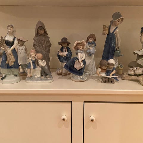 Lladro barnefigur som viser en jente iført blå kåpe, blå votter, beige bukser og lue. Figuren har en grønn ryggsekk og en liten hund ved siden av. Laget i porselen med detaljer i blått, beige og grønt.