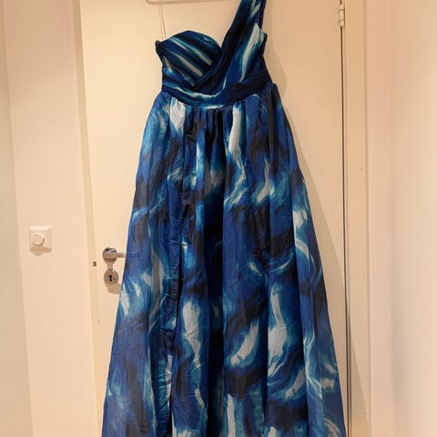 Ubrukt delikat, lang blå festkjole, størrelse XL