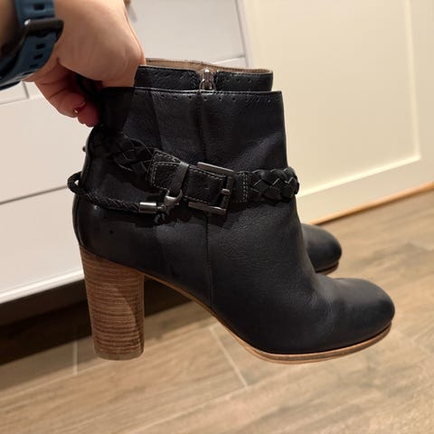 ECCO hæler i størrelse 40, farge svart. Laget i skinn. Designet for kvinner. Hælene har en bred form med spennedetalj ved ankelen.