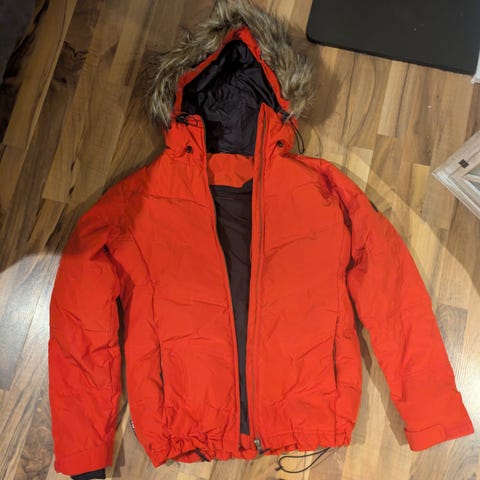 Dunjakken er brukt noen timer, veldig varm. Buksen har aldri vært brukt. Jakken har kult turkist mønster.