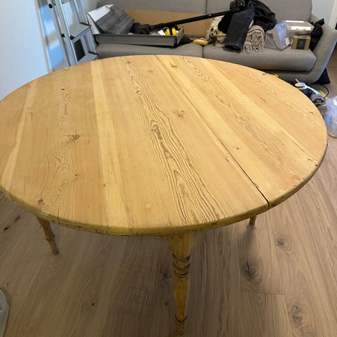 Med begge klaffer oppe er bredden 180 cm . God plass til 1-6 personer . Slagbord fra 1970tall . Klaffene kan hektes av . Beina kan demonteres . Pent og stødig bord med noen bruksmerker . Må hentes . Bor 3 min fra CC Drammen .