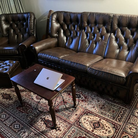 Pent brukt skinnsofa og to stoler samt salongbord