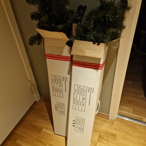 Selger pent og lite brukt juletre med fot i girlander, greinene kan formes for en fyldig utseende