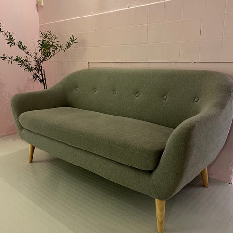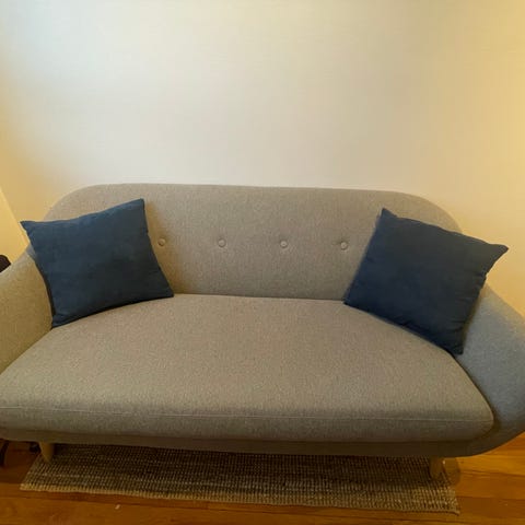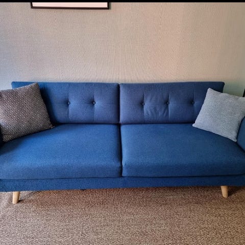 2-seters sofa med stofftrekk fra Jysk. Seteputer med pocket-fjærer og skumpolstring. Ryggputer i skum. Ben i massivt tre. B154 x H85 x D84 cm