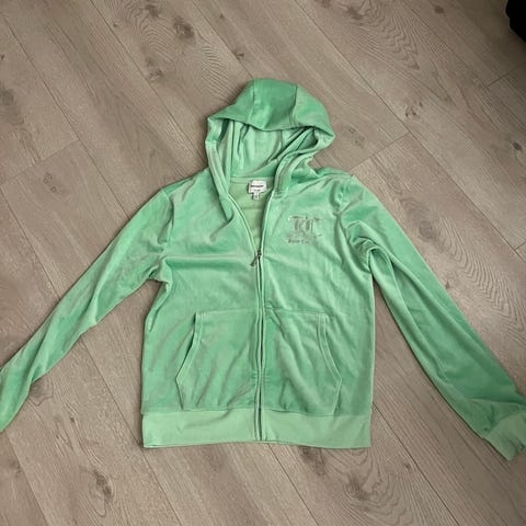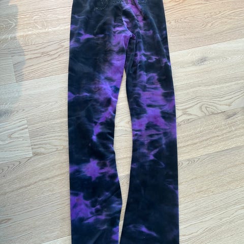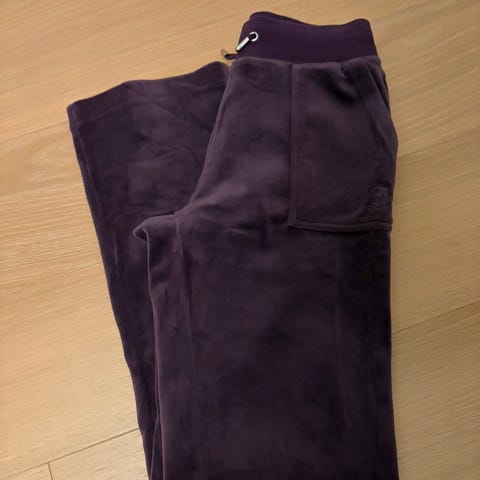 Juicy Couture joggebukse i svart fløyel, størrelse L for dame. Buksen har dekorative detaljer med blikkfang bak. Materialet er mykt og gir komfort ved bruk. Snora i livet er dessverre borte.