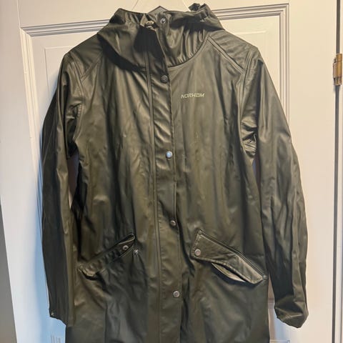 God regnfrakk str m. Med hette, glidelås,trykknapper. & Store lommer