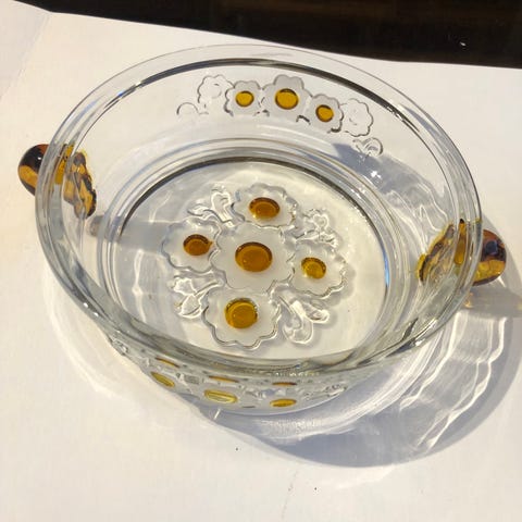 Nydelig 2 delt fat med dekor i gult selges for 50 kr. Walter glass.