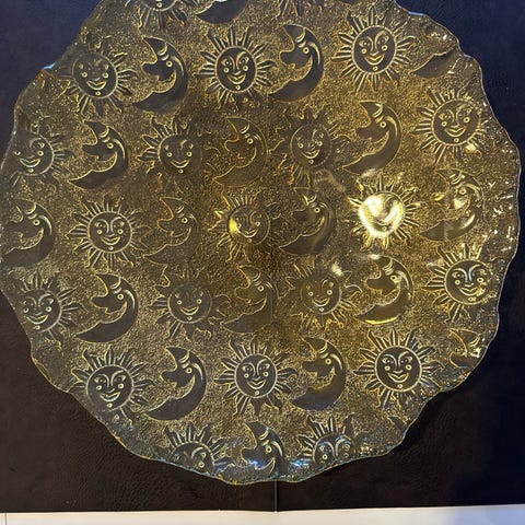 Nydelig 2 delt fat med dekor i gult selges for 100 kr. Whalter glass.
